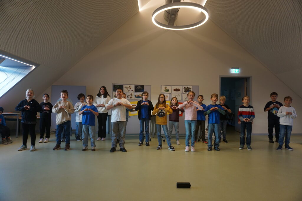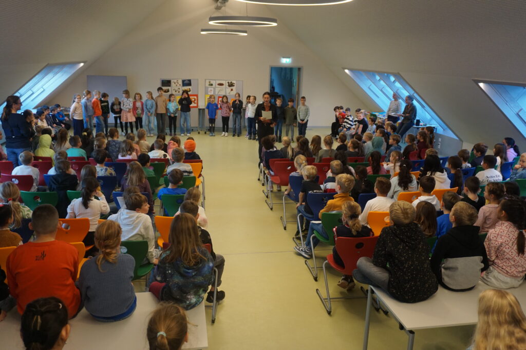 Zur Begrüßung hatten die Klassen 2, 3 und 4 gemeinsam mit ihren Lehrerinnen und Lehrern ein abwechslungsreiches Programm vorbereitet. Den Auftakt bildete ein gemeinsames Lied aller Klassen, mit denen sie die neuen Schulkinder herzlich willkommen hießen. Die zweiten Klassen sangen und tanzten auf der Bühne und luden beim Bewegungslied auch die Erstklasskinder zum Mitmachen ein.