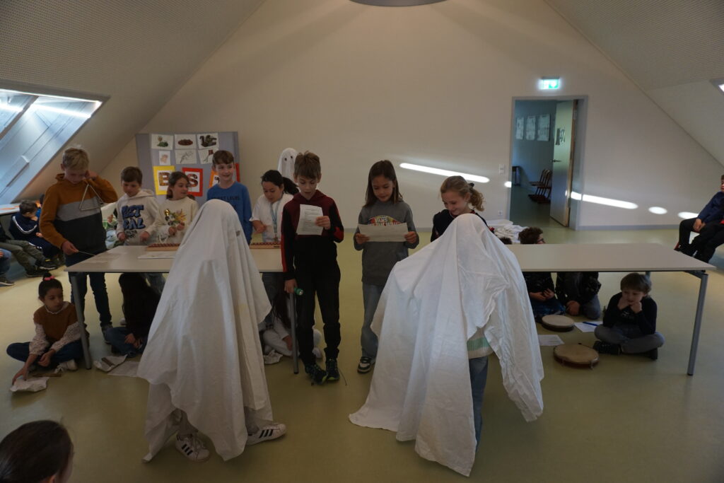 In jedem Klassenzimmer waren seltsame Wesen, hübsche Prinzessinnen, gruselige Monster und andere verkleidete Kinder und Lehrpersonen zu finden. Lustige Spiele und fröhliches Singen und Tanzen waren angesagt. Ausnahmsweise gab es an diesem Tag auch ein paar ungesunde Snacks: Gummibärchen, Chips und Schokolade verteilten sich schnell auf die Teller. Fröhliche Gesichter waren überall zu sehen. Egal ob Hexe, Drache, Astronaut oder Kämpfer, alle hatten was zu lachen. Mit der traditionellen Polonaise machte sich dann die ganze bunte Schulgesellschaft auf den Weg durchs Treppenhaus, hinaus auf den Nordhof und dann wieder hinauf unters Dach. Dort wurde zum Abschluss lauthals „Trat ich heute vor die Türe“ geschmettert und durch Stampfen, Tanzen und Klatschen untermalt. Und dann hieß es auch schon: Schöne Ferien!
